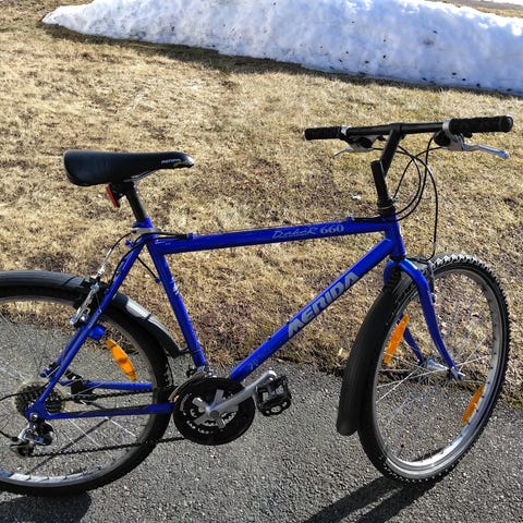 Monark svensktillverkad kvalitets mountainbike för kvinna/flicka med ramstorlek M och 26" hjul. Cykeln har en metallicgul ram. 21 växlar och handbromsar fram och bak, ej fotbroms. Lås finns.