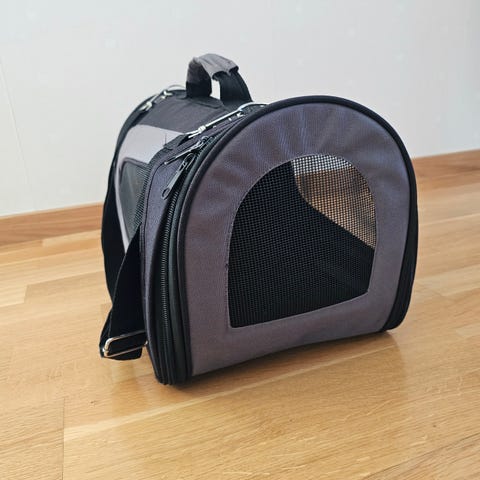 Transportväska för husdjur i grå textil med svarta detaljer. Väskan har öppning framtill med dragkedja och nätfönster, samt ytterligare nätpanel på sidan för ventilation. Baksidan har flera ventilationshål i metall. Utrustad med bärhandtag och justerbar axelrem. Invändigt finns en löstagbar bottenplatta för stabilitet och komfort. Lämplig för mindre husdjur som katt eller liten hund vid kortare resor eller transporter.