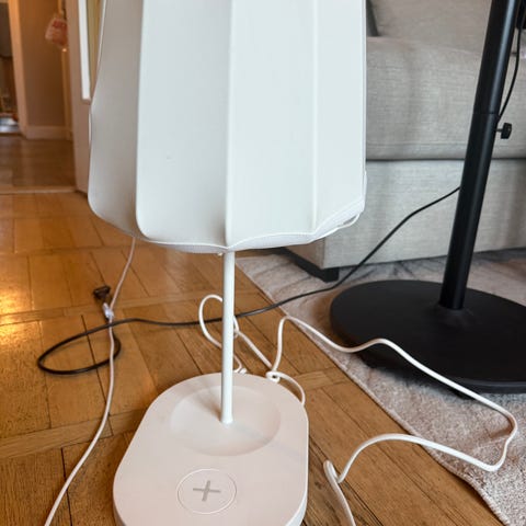 Bordslampa med vit konformad lampskärm och metallfot i borstad finish. Lampan har en smal, lätt böjd lampfot och strömbrytare på sladden. Passar som läslampa eller allmän belysning på skrivbord, sängbord eller sidobord. Ljuskälla med vanlig skruvsockel (ej inkluderad på bilden).