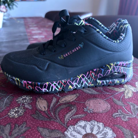 Skechers sneakers för barn, unisexmodell i storlek 35. Skorna är svarta med snörning och mellanhög skaftdesign. Ovandel i syntetmaterial med Skechers-logga på sidan och kontrasterande vit yttersula. Passar till vardagsbruk, skola och fritidsaktiviteter. Lite gulnande färg på sulan, annars bra skick.