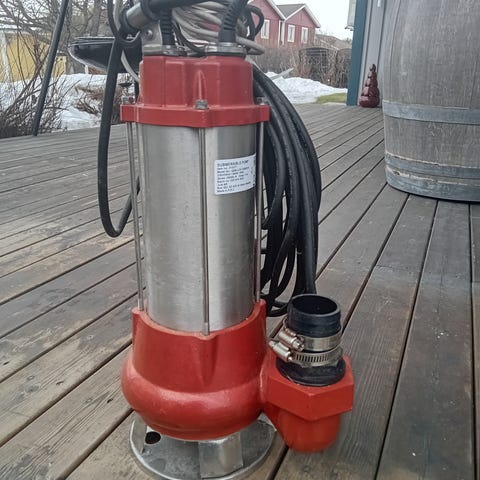Dränkbar pump på 1 000 W med rostfritt pumphus och klarar partiklar upp till 35 mm. Styrs med nivåbrytare. Köptes och användes en gång vid en översvämning.
