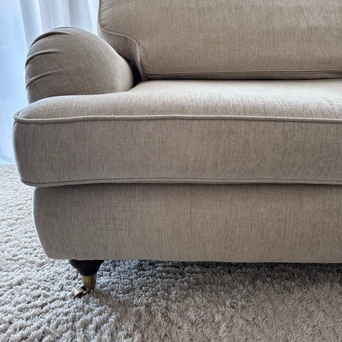Främre ben är av hjulmodell och det följer med silvriga coasters. Jag skulle vilja kalla det en Howardsoffa eller möjligtvis en Oxfordsoffa.