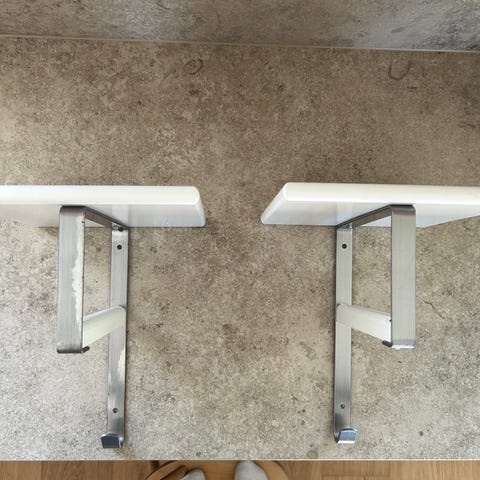 Väggmonterad hylla med extra belysning. Hyllan är vit med röd bakgrund i facken. Monteras på vägg för att frigöra golvyta.