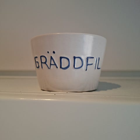Stor skål med blå text. Finns en nagg upptill på skålen. Se bild. Annars i fint skick.