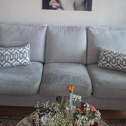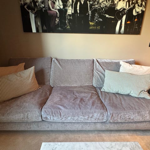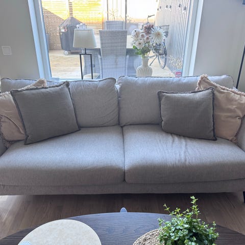 Mycket fin och knappt använd Madison soffa ljusgrå tyg mycket snygg soffa säljes pga flytt till mindre soffans storlek
