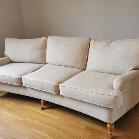 Divansoffa i tyg med träbenn i ek.