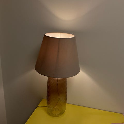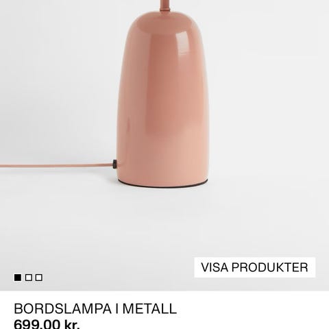Säljer en rostrosa bordslampa från H&M home då den tyvärr inte passar in efter flytt. Diameter på skärm 37 cm, totalhöjd 37 cm, sladdlängd 160 cm. Några små repor på skärmen, svåra att fota men se bilder 5 och 6.