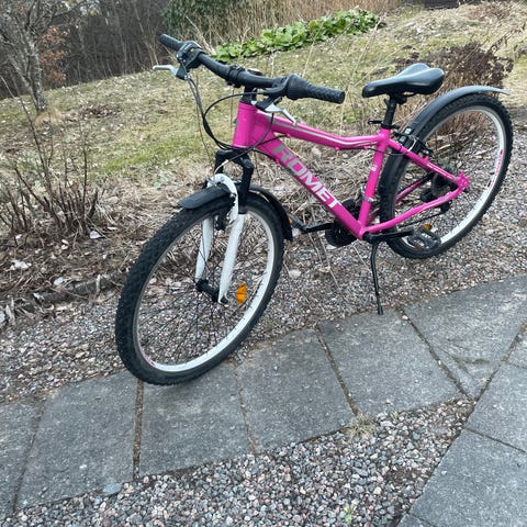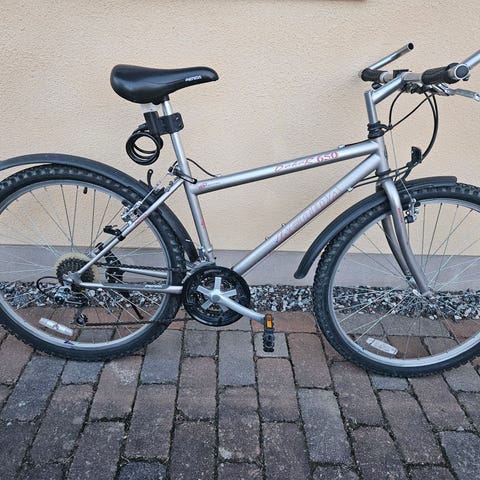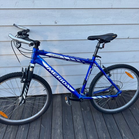 Nyservad Merida mountainbike 21 växlar med lätt aluminium storlek S och 26" hjul. Cykeln är i fint skick , rosa ram med vit fjädrad framgaffel, utrustad med fälgbroms fram och bak. Utrustad med stänkskärmar, reflexer och sadel anpassad för dam. Passar för cykling på grusvägar, terräng och vardagscykling.