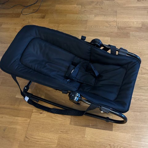 Babybjörn matstol i vit plast med svart underrede. Stolen har inbyggt bord och bygel framtill. Kompakt modell som tar liten plats och är enkel att flytta. Passar för små barn som kan sitta själva vid matbordet.