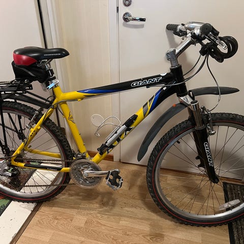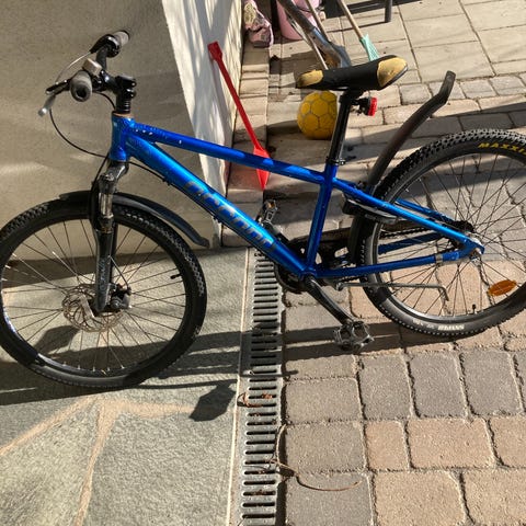 Sportig mountainbike med stötdämpad framgaffel, terrängmönstrade däck på 26" som hjälper föraren på grova underlag.