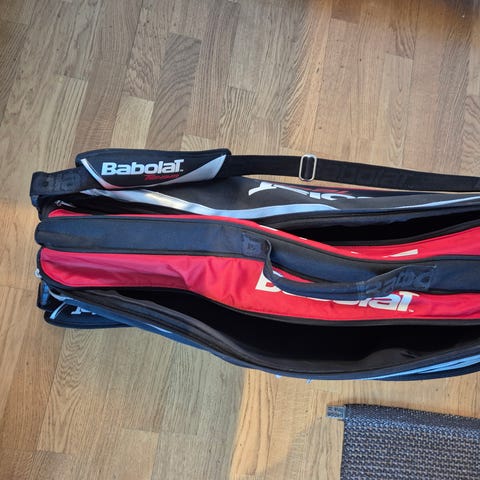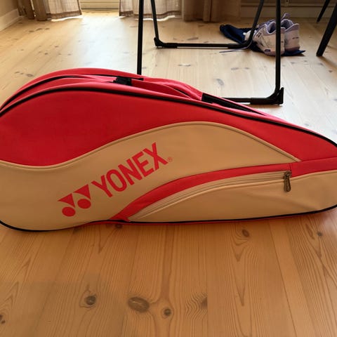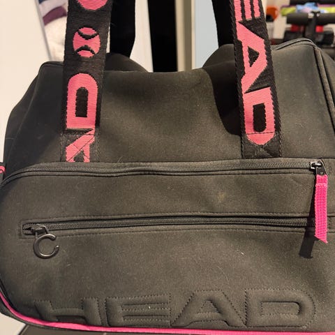 Head Team tennisväska i rosa färg med mörkblå detaljer. Väskan har flera dragkedjefack för racketar, kläder och tillbehör. Väska är i använd skick