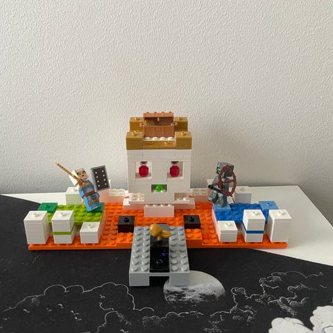 LEGO Minecraft byggset med marknadsmiljö och flera figurer. Setet innehåller en liten marknadsplats med bodar och tillhörande byggdelar samt minifigurer inspirerade av Minecraft, inklusive djurfigurer. Passar för lek och uppbyggnad av Minecraft-världar i LEGO-format.