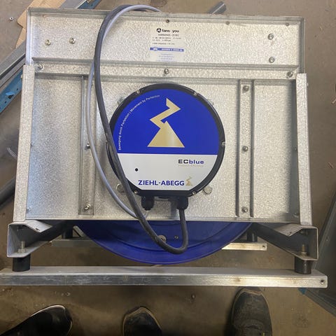 KMP pelletsskruv med tillhörande pelletsförråd. Utrustningen består av en metallkassett/förråd med lock och handtag, anslutningshål.