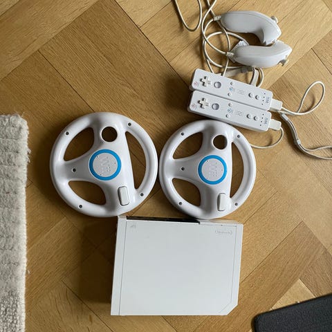 Nintendo Wii med handkontroller och spel