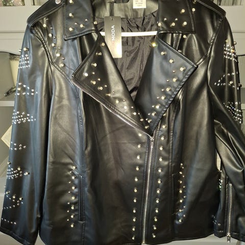 Motorcykelställ i skinn för dam i storlek XXL. Stället är flerfärgat med huvudsakligen svart skinn och kontrasterande partier i rött och vitt. Tvådelad design med jacka och byxa som kan kopplas ihop, samt förstärkningar över knäpartierna. Ryggskena. Säljes med stövlar storlek 40-41, hjälm storlek 59 och handskar.
