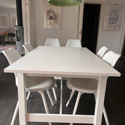 Stort robust bord från IKEA som har iläggskiva i bordet. Bordet har några repor/fläckar men är i övrigt i fint skick. Se bilder. Hämtas i Västerås.