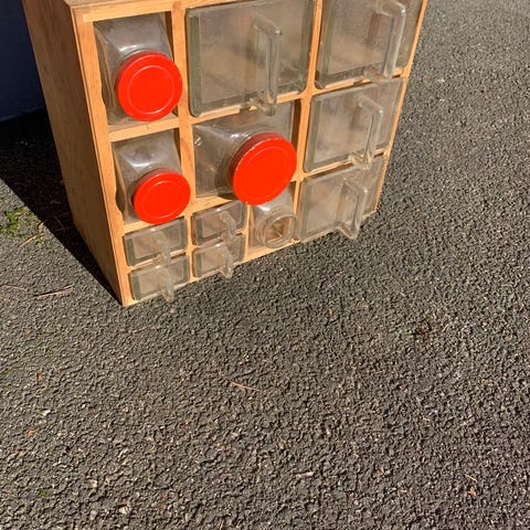 Retro kryddhylla med fack för 11 behållare i plast – charmig köksdetalj 🌿
