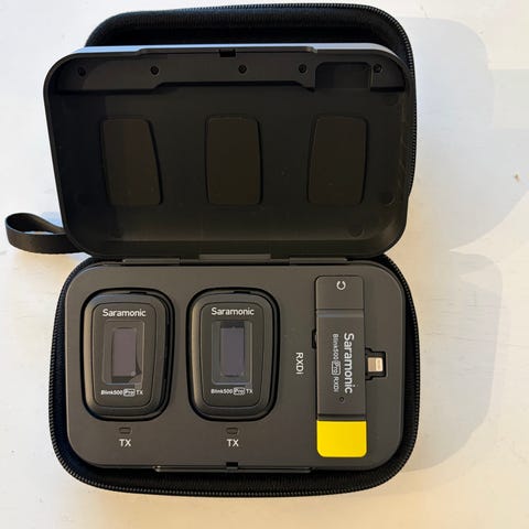Røde Wireless Micro trådlöst mikrofonset för iOS-enheter med Lightning-anslutning. Systemet består av en kompakt mottagare och en sändare med inbyggd mikrofon, levererade i ett laddningsetui. Designat för inspelning av tal och ljud direkt till iPhone eller annan iOS-enhet med Lightning-kontakt. Mikrofonen har inbyggd Gain Assist-funktion för automatisk nivåanpassning. Passar exempelvis för videoinspelning, vloggning, intervjuer och röstinspelning där trådlös anslutning önskas. Färg: svart.