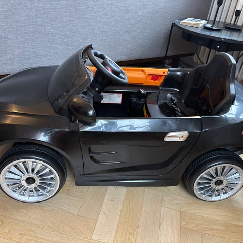 Ferrari elbil för barn i röd färg. Bilen är utformad som en sportbil med en sits, ratt och fotpedaler anpassade för barn. Karossen är i plast med detaljer som fälgar, backspeglar och dekaler. Elbilen drivs av batteri och laddas med medföljande batteriladdare. Passar för lek utomhus på plana underlag som asfalt eller stenlagd gård. Ratten har enkla reglage och bilen har låg sitthöjd så att barnet lätt kan kliva i och ur. Diverse lackskador/skrapskador. Separat laddare medföljer.