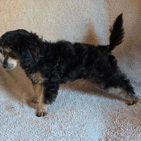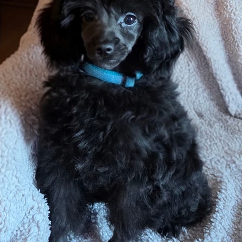 Mamma är Crestepoo (Blandning Kinesisk Nakenhund och Dvärgpudel) färgen silver och född svart så bleknat med åldern. Hon är 26 cm hög väger 3-4 kg.