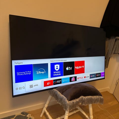 LG TV. Platt skärm med bordsstativ. Bildpanelen visar omfattande skärmskador med vertikala och horisontella linjer över större delen av bilden, vilket tyder på defekt skärm. Kan vara aktuell för reservdelar eller reparation av komponenter som inte rör bildpanelen, exempelvis elektronik, fjärrkontroll eller stativ om dessa finns kvar.