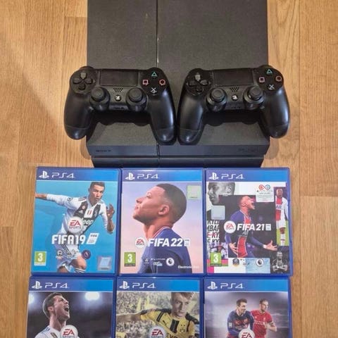 Sony Playstation 4 spelkonsol svart med två handkontroller och spel