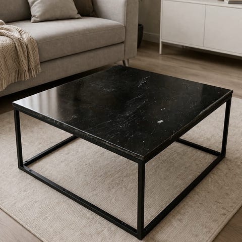 Bordsskiva i vit marmor som ger ett exklusivt uttryck, kombinerat med svartlackerade metallben för en modern och stabil känsla.