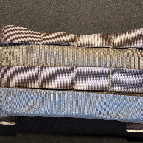 Den har kardborreband på baksidan (se bild) som gör den perfekt att tex ha på solstolen etc för att förvara småsaker och mobil tex. Det finns en liten mobilficka och det stora facket har dragkedja.
