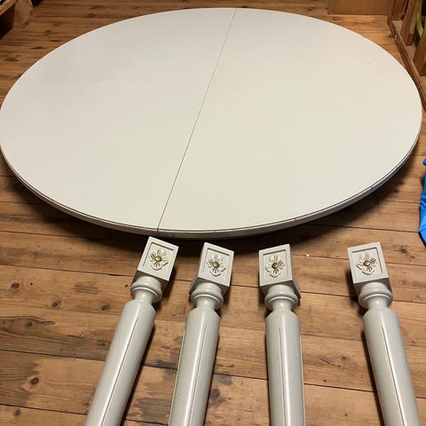Slitage: Repor och fläckar på bordsskivan och stolarna förekommer. En av stolarna är sprucken vid ena benet men går att laga och fungerar att sitta på i nuläget. En ommålning kan behövas men i övrigt är allt i gott skick.