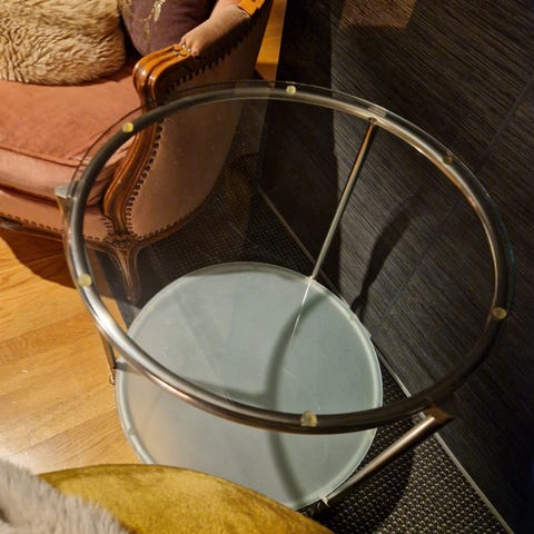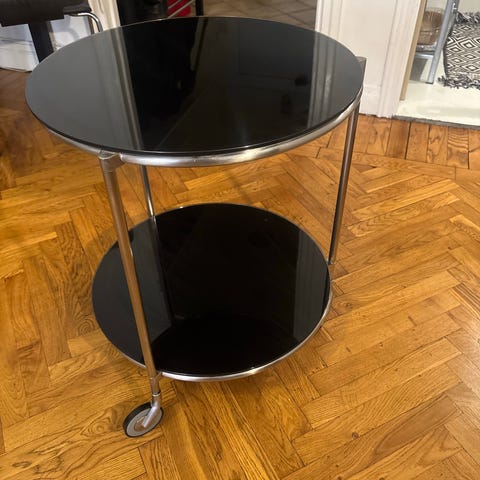 Två hyllplan i svart glas och kromad metallram. Bordet står på hjul vilket gör det lätt att flytta – perfekt som sidobord, nattduksbord eller drinkvagn.