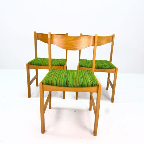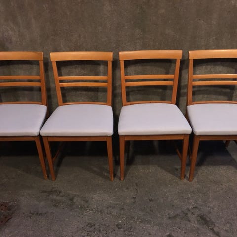 Två eleganta stolar, trästomme med klädd sits. Ryggstöd i formpressat trä och raka ben.