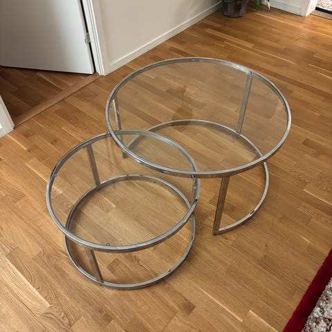De har lätta fläckar och lite avskavt på ena hörnet. Går att snygga till för den händiga. Borden går att placera i varandra.