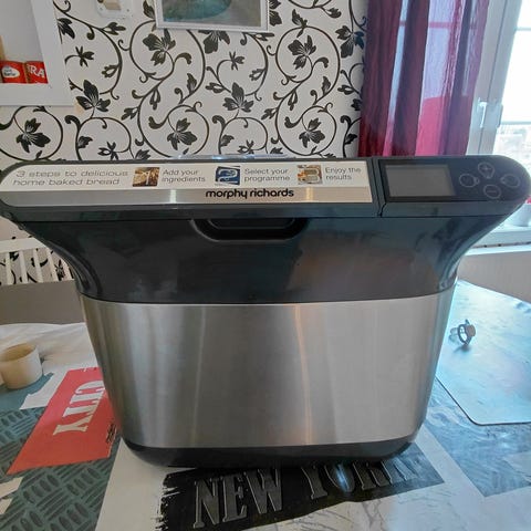 Morphy Richards brödmaskin i rostfritt stål. Maskinen har flera förinställda program för olika typer av bröd och deg, bland annat fransk, sandwich, pizzadeg, glutenfritt, snabblägen samt program för kakor och desserter. På ovansidan finns ett lock med fönster och en ingrediensbehållare. Kontrollpanelen sitter framtill med programöversikt på sidan. Passar för hemmabak av olika sorters bröd och degar.