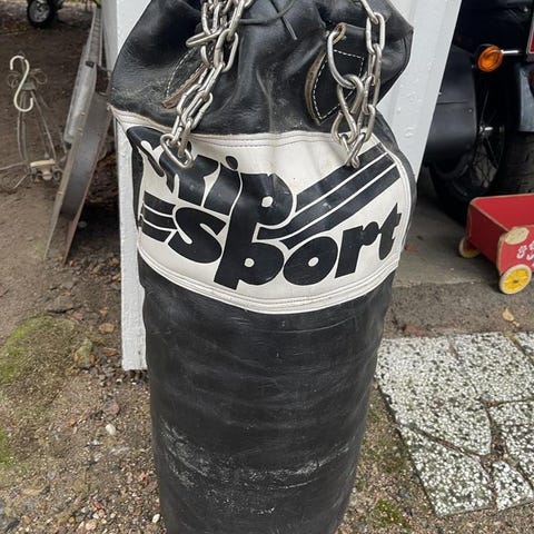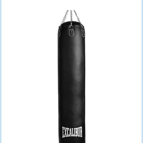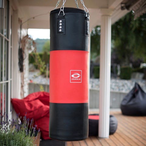 Boxningssäck i svart och röd färg med kedja för upphängning i tak eller ställning. Passar för boxning, kickboxning och annan kampsportsträning.