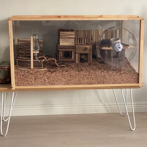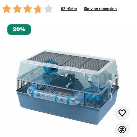 Hamsterbur i 3 våningar av plast och metallgaller med genomskinligt överdel och blå botten. Buren är utrustad med rörsystem i plast som kan byggas i olika kombinationer, tystgående löphjul, matskål, vattenskål, litet sandbadkar och en liten koja. Överdelen har galler för ventilation och öppning upptill samt lås framtill. Passar för mindre gnagare som hamster eller liknande smådjur.