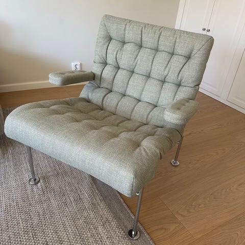 DUX Bruno Mathsson fåtölj med stoppad sits och rygg i grön textilklädsel. Fåtöljen har vadderade armstöd i samma tyg och ett kromat metallunderrede med fyra ben.