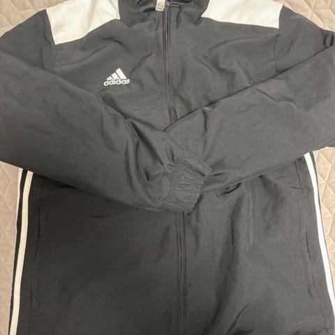 Adidas träningsjacka för unisex i storlek L. Jackan är svart med vita ränder längs ärmarna och dragkedja framtill. Jackan är helt ny och oanvänd endast testad.
