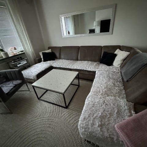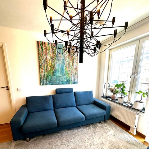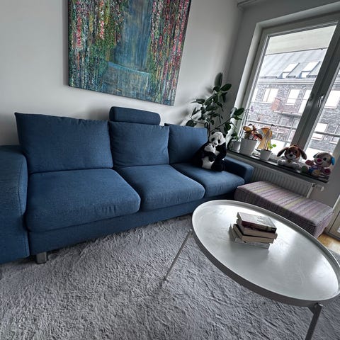 Soffa 3-4 får plats. Den är stadig och bekväm, har alltid städat den och haft soffskydd på. Jag ska förnya mitt rum och behöver därför med ( lite sorg) sälja den , trots min nöjdhet. Kvitto finns kvar och garantin är nog över. Färg på klädseln går att byta ut på IKEA. Bärhjälp finns inte. Jag tar inte swish.