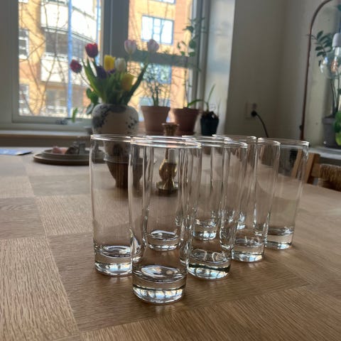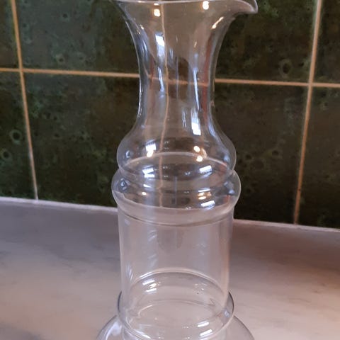 Karaffer i genomskinligt glas. Setet består av två karaffer i olika storlek, båda med handtag och hällpip. Passar för servering av vatten, saft eller andra drycker i kök och matsal. Den ena är från Duka den andra vet jag inte