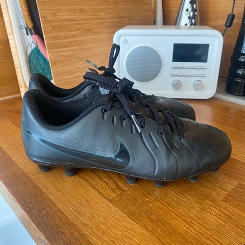 Nike fotbollsskor i storlek 36. Två par med snörning, ett par i blå färg och ett par i neongul färg med röda detaljer. Avsedda för fotboll och liknande bollsporter. Skorna har låg modell och är utformade för användning på plan. Passar barn eller ungdom med skostorlek 36.