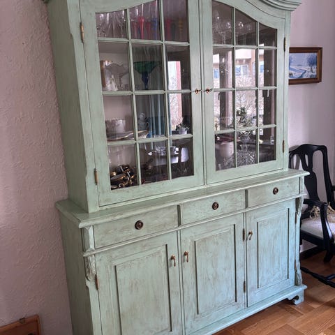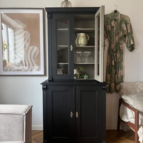 Svart vitrinskåp, överdel med glasdörrar och hyllplan för förvaring av porslin och glas. Mellandelen har tre lådor med metallhandtag. Underdelen består av skåp med hela dörrar för dold förvaring. Ett hyllplan i varje skåp.