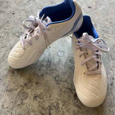 Adidas fotbollsskor i vitt med blå och röda detaljer. Skorna har snörning framtill och låg modell runt ankeln. Ovandelen är i syntetmaterial och sulan är anpassad för spel på plan. Skorna har handskrivna autografer på ovandelen. Passar för fotbollsträning eller matchspel beroende på storlek och underlagstyp som anges av säljaren. Storlek 35