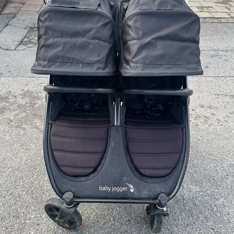 Joie syskonvagn/dubbelvagn i svart färg med två sittdelar bredvid varandra. Vagnen har individuella suffletter och justerbara ryggstöd för varje sittdel, samt en korg under.