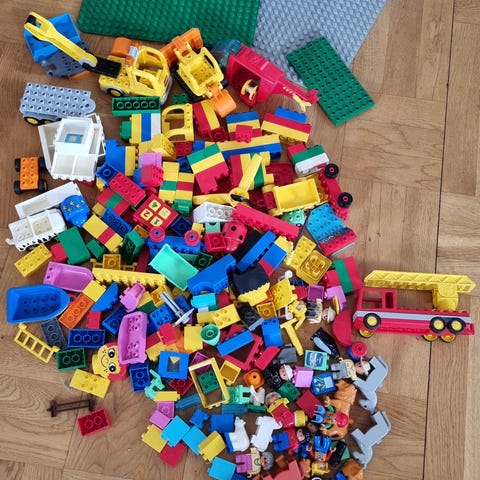 Lego Duplo klossar och byggplattor blandat set. Innehåller en större mängd Duplo-klossar i olika former och färger samt flera byggplattor i olika färger. Passar för lek, byggande och skapande för yngre barn som använder Duplo-systemet.