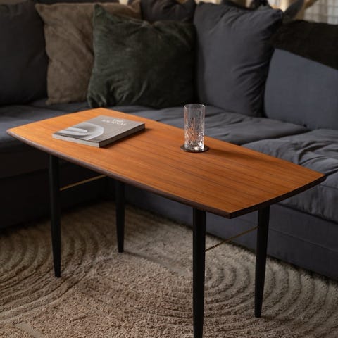 Teak faner, svarta ben med mässingdetaljer. Lite märken på bordsskivan (se bilder)