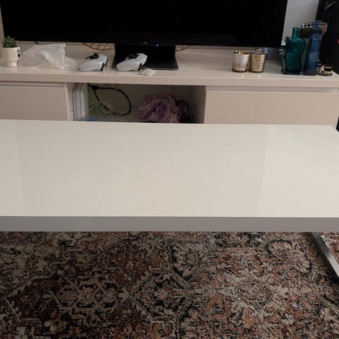 Tv-bänk i beige färg med en rymlig låda för förvaring. Bänken står på ben i metallfärg och har en slät, modern design som passar under väggmonterad tv och också soffbord. Lämplig för vardagsrum för förvaring av mediautrustning, spelkonsoler eller andra tillbehör.