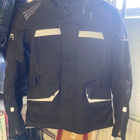 motorcykeljacka och byxor i svart färg. Jackan är i textil med midjebälte, flera ytterfickor, reflexdetaljer och logotyp på bröst och rygg. Byxorna är svarta med flera fickor, förstärkta partier och reflexdetaljer. Setet är avsett för motorcykelkörning och ger täckning för överkropp och ben.