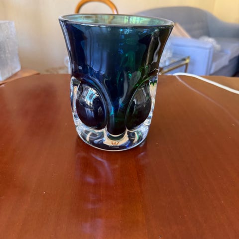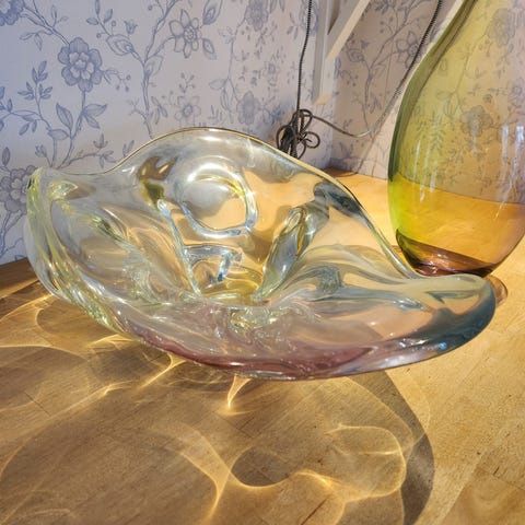 Kosta Boda Fidji vas design Göran Wärff i glas med hög, smal form och rundad botten. Vasen har flerfärgad toning i bland annat gröna och lila nyanser. Passar som dekorationsföremål eller för snittblommor och grenar i hemmet. Dock köpt på outlet i Kosta Boda.9