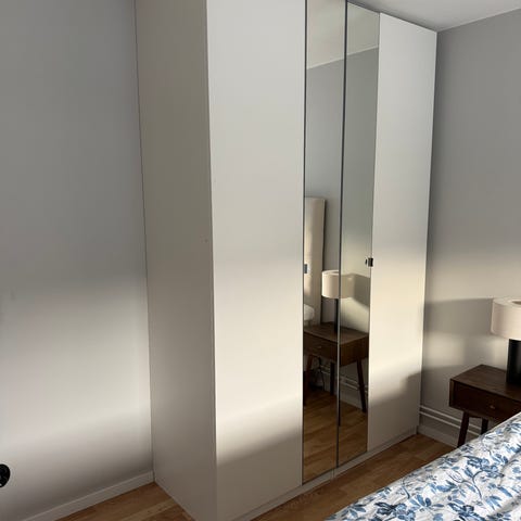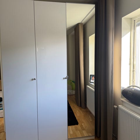 Säljer en rymlig och stilren garderob i mycket gott skick. Garderoben har spegeldörrar som ger ett ljust och luftigt intryck samt gott om förvaring.