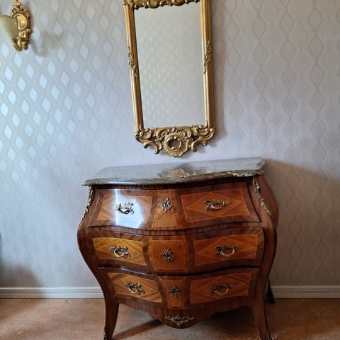 Byrå i trä med brunlaserad yta och svängda former. Överdelen består av en marmorskiva i grå toner. Byrån har flera lådor med metallbeslag och handtag. Passar exempelvis i hall, sovrum eller vardagsrum för förvaring av kläder, textilier eller mindre föremål.